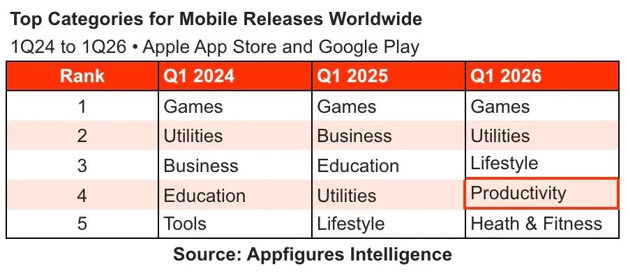 从 Appfigures 的分类数据来看,手机游戏依然占据全球新应用发布量的首位,这与历年规律一致。真正值得关注的变化发生在其他类别:“效率工具”( Productivity )今年首次跻身前五,“实用工具”( Utilities )类上升至第二位,“生活方式”( Lifestyle )从去年的第五位升至第三位,“健康与健身”( Health & Fitness )类则补位第五。